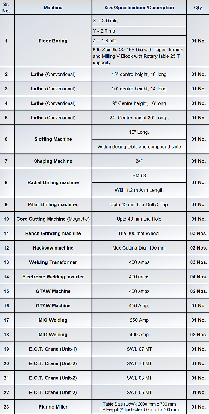 List of Major Fabrication & Machining Facilities Available at Our Premises